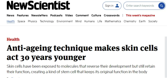 一则来自NewScientist的报道,研究人员开发出一种方法,可以将皮肤细胞“年轻”30岁,从成熟细胞中制造干细胞,未来可用于针对皮肤相关的疾病。