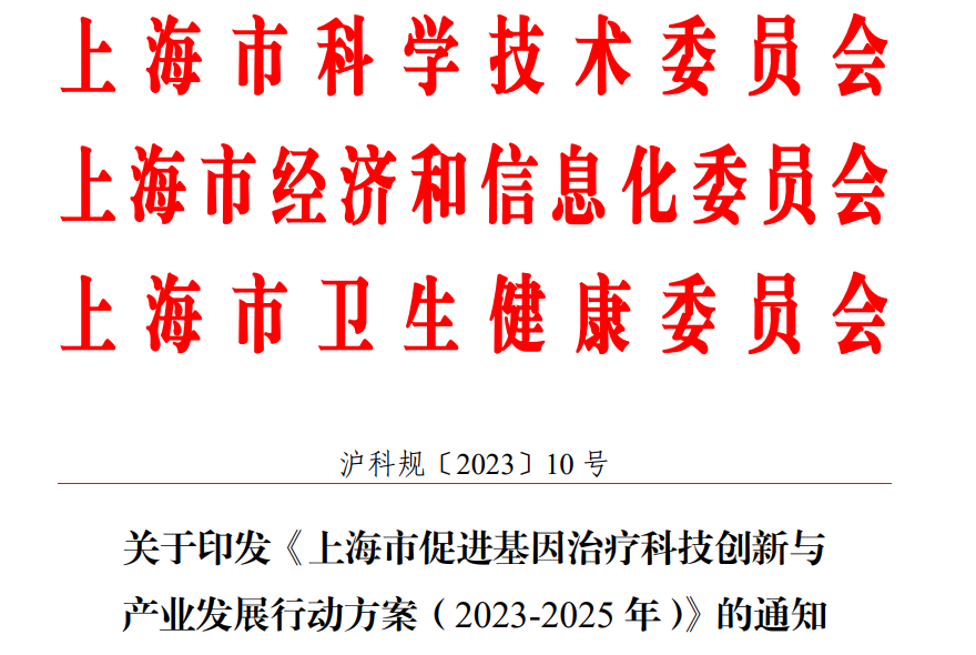 2023年9月上海市印发《上海市促进基因治疗科技创新与产业发展行动方案(2023-2025 年)》。