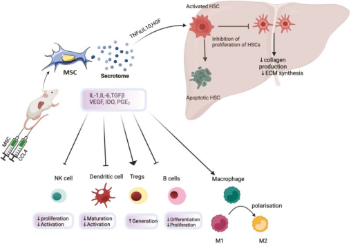 肝纤维化是慢性炎症性肝损伤的最后常见途径,由肝星状细胞(HSC)的激活介导,HSC是纤维化发生的关键效应因子间充质干细胞在其分泌组中释放各种可溶性因子,包括白细胞介素-1(IL-1)、白细胞介素-6(IL-6)、转化生长因子β(TGF-β)、血管内皮生长因子(VEGF)、吲哚胺2,3双加氧酶(IDO)、肝细胞生长因子(HGF)、肿瘤坏死因子α(TNFα)。这些介质通过抑制肝星状细胞(HSC)的增殖以及诱导HSC凋亡来调节肝纤维化。这导致胶原蛋白的合成减少和细胞外基质(ECM)的合成减少。间充质干细胞诱导的免疫细胞调节,包括自然杀伤细胞(NK)、调节性T细胞(Tregs)等,减少肝脏炎症细胞的膨胀,从而发挥抗炎作用。这种免疫调节还具有间接的抗纤维化作用。巨噬细胞从促炎(M1)到抗炎(M2)表型的极化也在此过程中起着关键作用。所有这些因子都抑制ΗSCs的增殖。