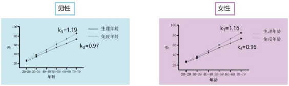 此外无论男女,免疫年龄的衰老程度随着生理年龄增长逐渐增加。20-40岁群体中,免疫年龄与生理年龄相一致,40岁以后,生理年龄越大,免疫年龄的衰老程度越高,且免疫年龄随年龄增长的幅度在男性中比女性更大(如图,k1-k2>k3-k4)。