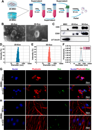 研究团队采用甲基丙烯酰化明胶(GelMA)水凝胶培养 MSCs,使用差速和超速离心法成功获得3D-Exos。与二维培养的MSCs相比,在3D培养体系中,MSCs分布更为均匀,Sox2和Nanog等干性标记物的表达水平显著更高,为后续的治疗效果奠定了坚实基础。对3D-Exos的特性研究发现,尽管其在形态和直径上与2D-Exos相似,但从相同数量的2D-MSCs或3D-MSCs中收集的相同体积的上清液中提取的外泌体,3D-Exos浓度比2D-Exos高出1.5倍,并且在被角膜上皮细胞和角膜基质细胞内化的过程中表现更为优异。在促进细胞增殖和迁移的实验中,3D-Exos也展现出卓越的性能。此外,3D-Exos能够有效维持角膜缘干细胞的干性,抑制其向终末成熟角膜上皮细胞分化,同时减少角膜基质瘢痕形成,对于角膜的修复和功能恢复具有重要意义。