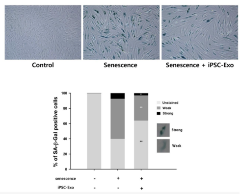 同时,研究人员还发现通过干细胞外泌体还可以减少身体中SA-β-Gal表达的水平,进而恢复衰老细胞中 I 型胶原蛋白的表达。这些结果表明干细胞具有帮助皮肤在对抗老化的潜力和广阔的应用前景。