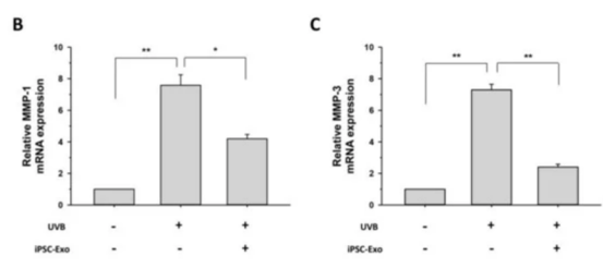 来自韩国仁川国立大学的一项研究发现,干细胞外泌体可以降低我们皮肤内基质降解酶MMP-1和MMP-3的水平,从而提高皮肤中I型胶原蛋白的合成,减缓皮肤因紫外线照射过早老化。