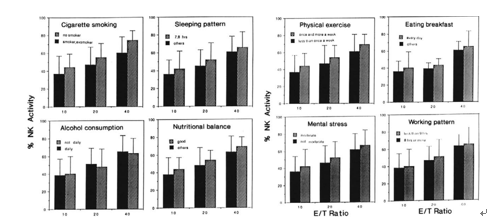 日本学者1992年在《Preventive Medicine》上发表了题为“Healthy lifestyles are associated with higher natural killer cell activity”的文章。该研究对62名30至60岁的健康男性进行了调查,通过问卷评估他们的八种健康习惯,如吸烟、饮酒、睡眠等,并分组比较。结果发现,具有良好生活习惯的个体,其NK细胞活性明显高于生活习惯较差的人。
