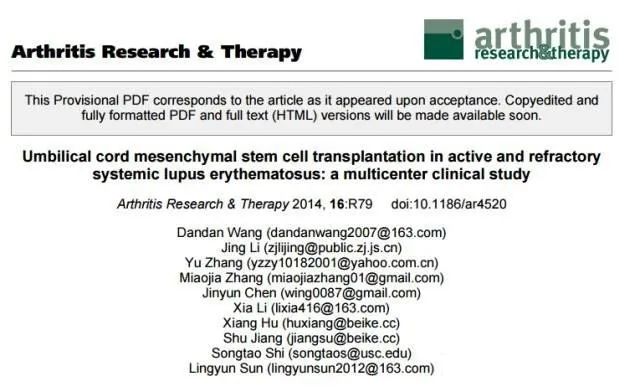 [4]Wang D, Li J, Zhang Y, et al. Umbilical cord mesenchymal stem cell transplantation in active and refractory systemic lupus erythematosus: a multicenter clinical study. Arthritis Res Ther. 2014;16(2):R79.
