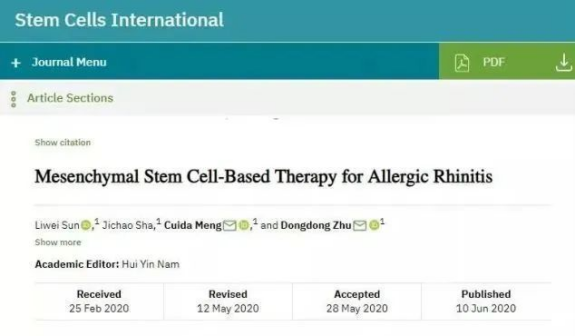 2020年,一项间充质干细胞治疗鼻炎的应用研究发表在《Stem Cells International》上,介绍了干细胞免疫调节作用的机制及基于干细胞的鼻炎临床治疗方法应用,干细胞可能会成为未来鼻炎治疗最有希望的策略之一。