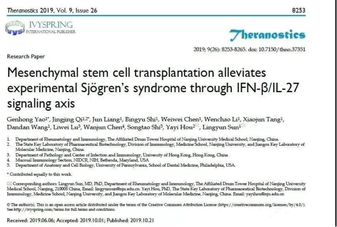 2019年,南京鼓楼医院的孙凌云教授和南京大学医学院的侯亚义教授团队成员在《Theranostics》上发表论文,报道了间充质干细胞通过促进树突状细胞分泌白细胞介素IL-27来改善干燥综合征症状,揭示了间充质干细胞在干燥综合征临床应用方向的新机制。