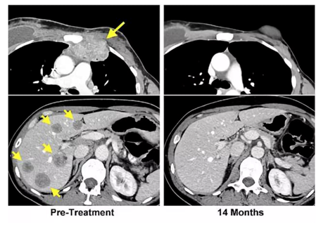在22个月后,该患者体内各处的肿瘤体积就大幅缩小,在结束治疗的14个月后,复查也显示,该名患者原发部位的肿瘤消失了。