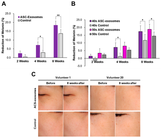 研究人员随机选择了21名女性志愿者【30~40岁2名,40~50岁11名,50岁以上8名】分为安慰剂组(不含ASC-外泌体)和实验组(含ASC-外泌体),开展为期8周的研究。在治疗前和治疗后2、4和8周使用Mexameter测量黑色素水平。