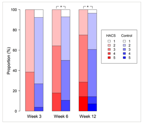 接受治疗后,参与者面部两侧的全球美学改善量表(GAIS)评分逐渐升高,其中接受HACS治疗的面部改善效果更明显。随着时间发展,第6周时HACS组面部改善效果显著优于对照组。在最后一次随访(第12周)时,相比于对照组,HACS组在面部皮肤老化方面的改善效果更显著,表明了HACS改善面部老化的有效性。